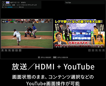 放送/HDMIと放送の組み合わせはもちろん、YouTube、AirPlay、スクリーンミラーリングとの2画面にも対応。放送を見ながらネット動画、SNS動画、ビデオ通話などマルチに楽しめます。
