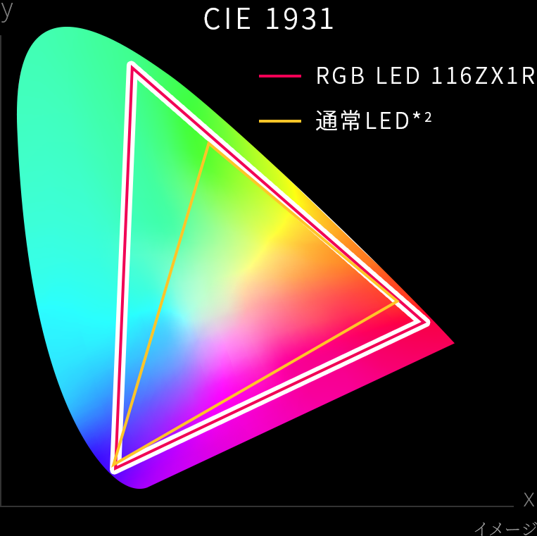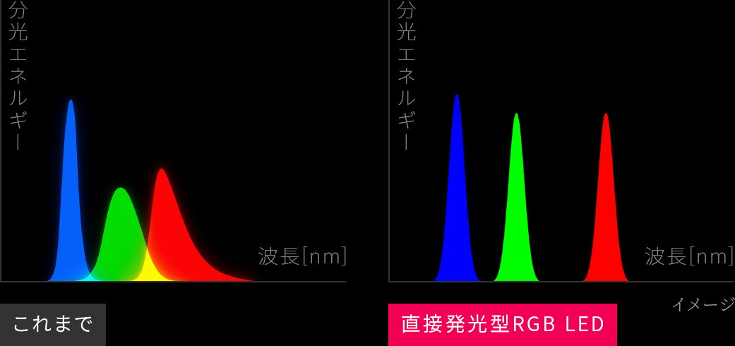 RGBの各LEDを独立して高色純度で発光することで、従来比110%*1の広色域化を実現。