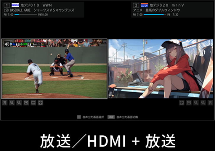 放送/HDMIと放送の組み合わせはもちろん、YouTube、AirPlay、スクリーンミラーリングとの2画面にも対応。