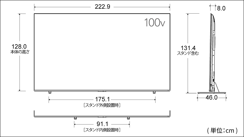 | 外形寸法(スタンド付き) | 幅 222.9cm,高さ 131.4cm,奥行 46.0cm |