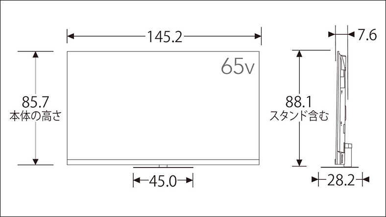 | 外形寸法(スタンド付き) 幅×高さ×奥行 | 145.2cm×88.1cm× 28.2cm |